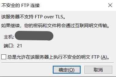 在想要连接FTP server的设备上运行FileZilla client这样的软件。建立连接时有如下提示,也就是没有做加密。