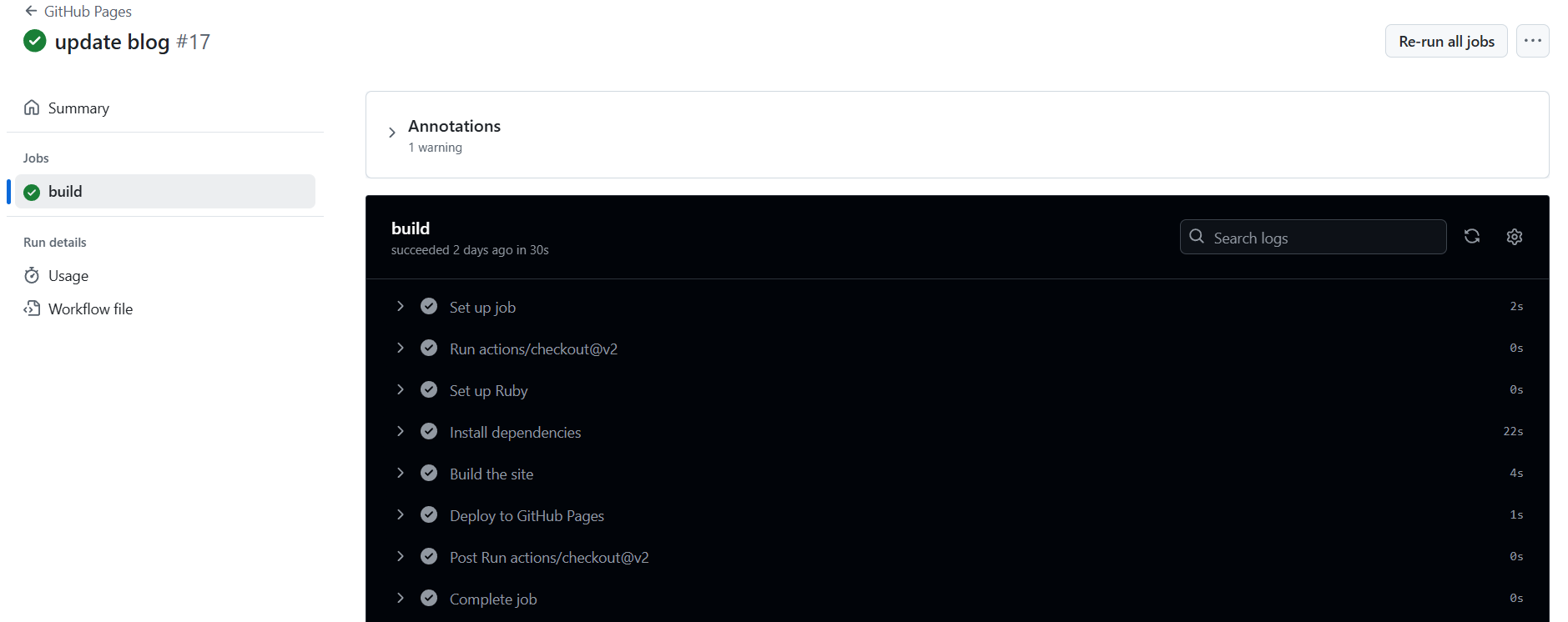 对于一般的静态网页而言,我们只需要将jekyll项目提交到名为username.github.io的仓库中(名字需要和github的账户名字一致,否则会无效),然后再选择Settings-Pages-Deploy From a Branch,branch-main。完成设置以后,就可以实现静态网页的部署了,Github会在Action中自动新建一个名为pages-build-deployment的工作流,每次选定的分支(main)上发生推送时会自动地构建和部署网页。